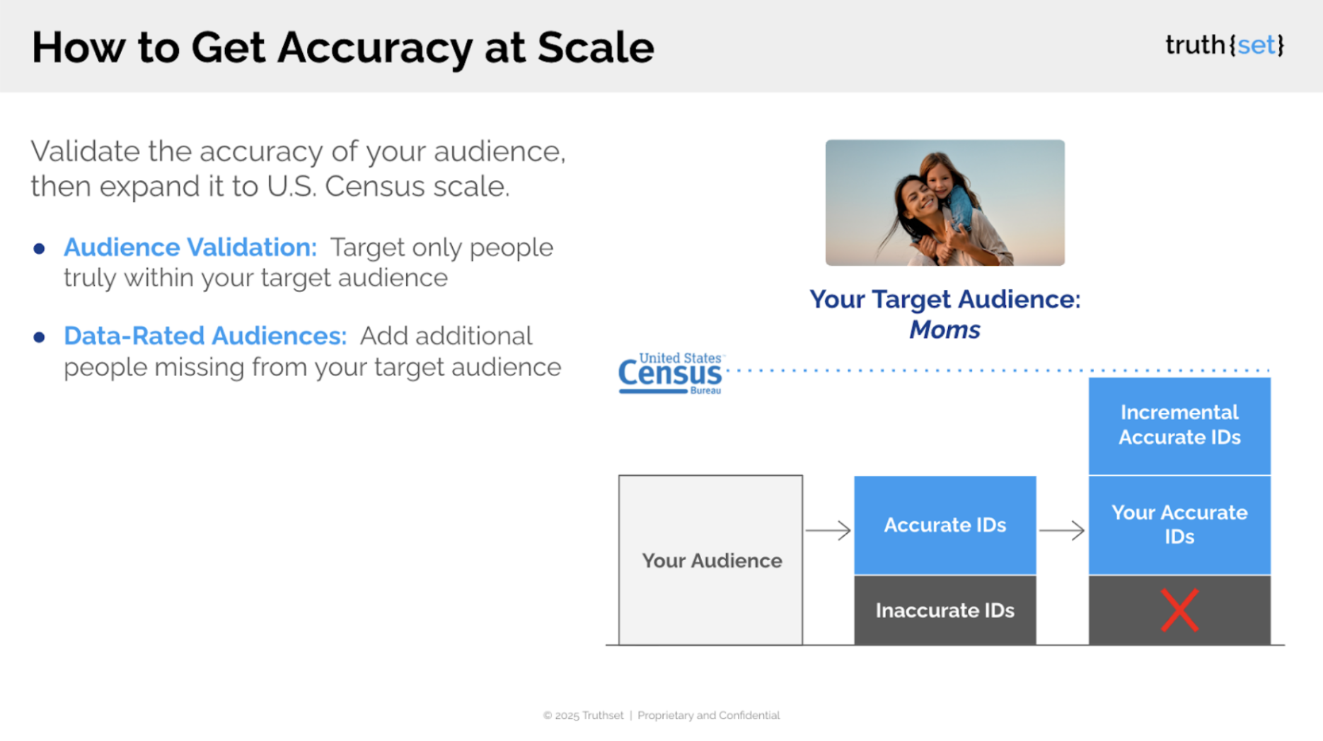 Initial Data Quality Assessment: Truthset’s Consumer Demographic Insights capability helps companies accurately understand the profile of their first party customer data, against more than a dozen demographic attributes, including age, gender, household income, presence of children, location, and many more, from home ownership to pet ownership.